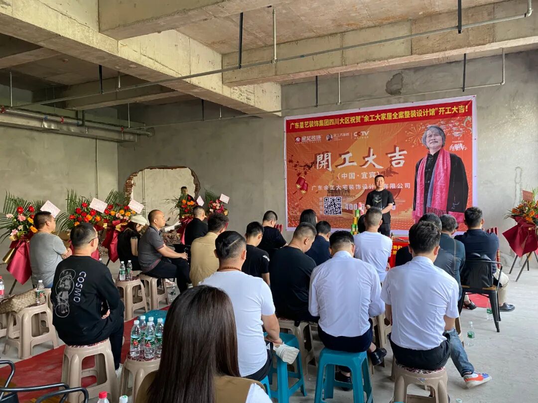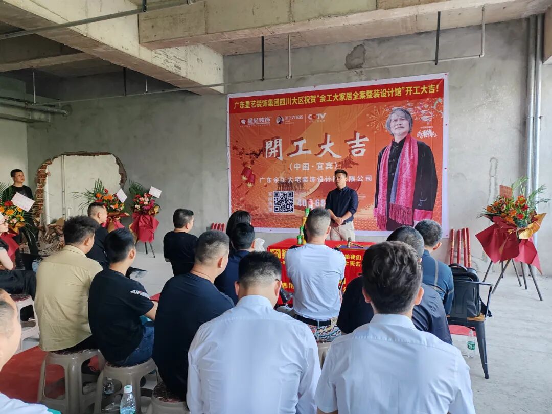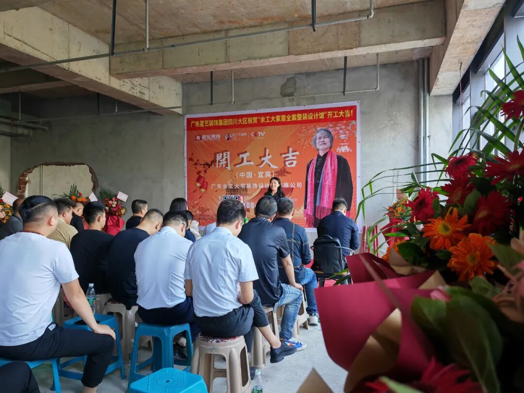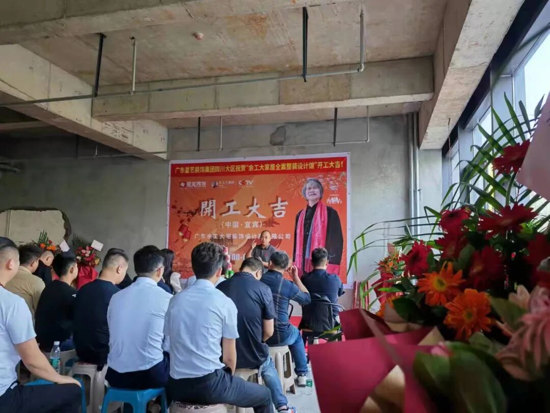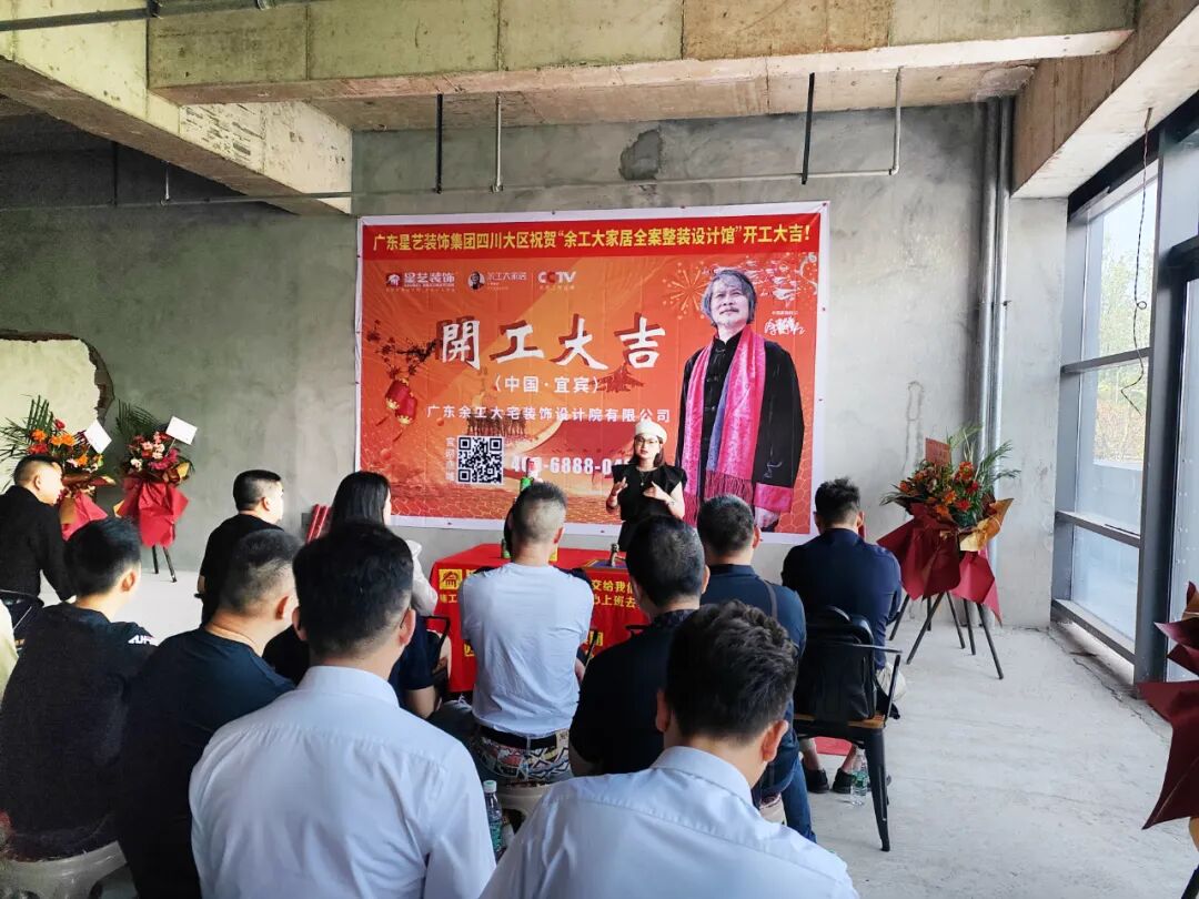 广东星艺装饰集团四川有限公司执行董事、余工大家居联合创始人程碧校长、广东余工大宅装饰设计院有限公司程于宸执行院长、宜宾装饰建材商会副会长/帝王洁具、惠达卫浴、乐家卫浴黄中全先生、宜宾装饰建材商会秘书长/ 诺贝尔瓷砖邹敏女士,大商:英爵音响/智能灯光冷总、马可波罗瓷砖肖总、大自然木业杨宇翔总等嘉宾及业主朋友、材料商朋友、公司员工及社会各界朋友…共同见证了此次盛大开工仪式。